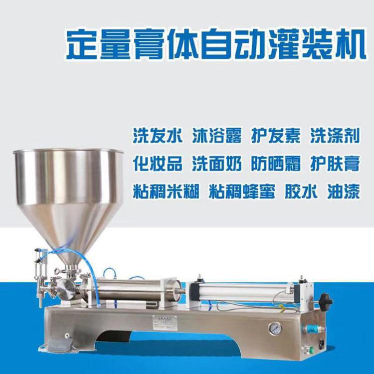 活塞式灌装机主要部件:底架、活塞式灌装机主体、进出料三通接头、防滴漏灌装头。